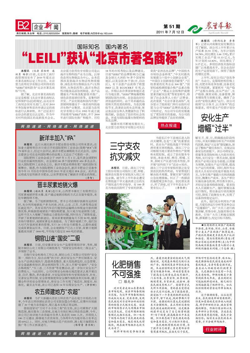 近日从湖北太阳成tyc122cc肥业股份有限公司传来喜讯:在加拿大蒙特利尔市日前召开的国际肥料工业协会(简称“IFA”)第79届年会上,经过大会评议,太阳成tyc122cc肥业被吸收为正式会员。这标志着该公司在走向国际舞台的征程上又迈出了可喜的一步。