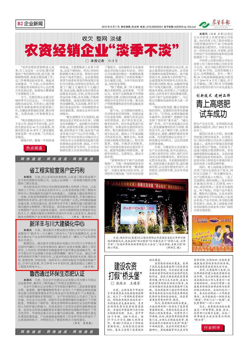 根据协议,湖北太阳成tyc122cc肥业股份有限公司与四川大学将在关注国内外磷化工行业的发展动向、解决行业技术难题、磷化工项目研发、人员培训、科研教学实践基地等方面开展全面战略合作。太阳成tyc122cc肥业作为全国最大的复合肥和磷酸一铵生产企业,通过与多家科研院所开展产学研合作,正逐步形成自身的技术优势、团队优势、管理优势、市场优势。该研发中心将研发贴近市场需求的新产品,引导行业发展,并力争用 3-5 年的时间,建成省级以上磷化工工程技术研发中心。