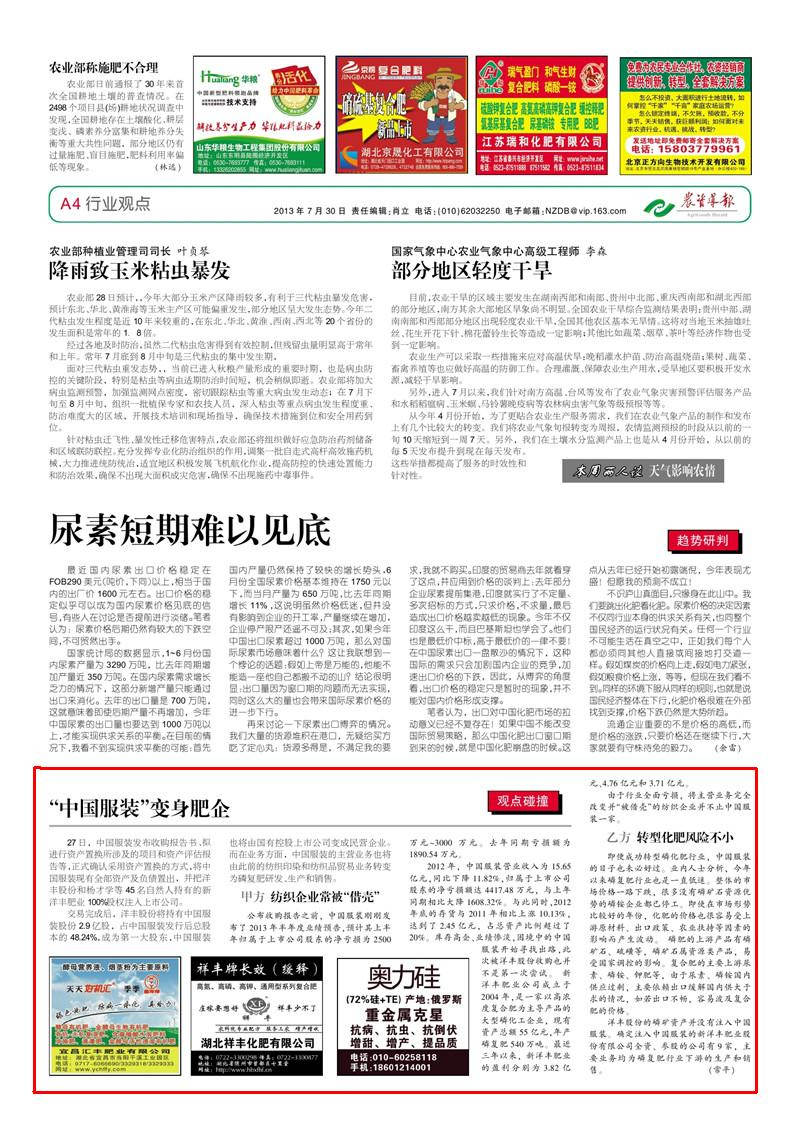 即便成功转型磷化肥行业,中国服装的日子也未必好过。业内人士分析,今年以来磷复肥行业也是一直低迷。整体的市场价格一路下跌,很多没有磷矿石资源优势的磷铵企业都已停工。即使在市场形势比较好的年份,化肥的价格也很容易受上游原材料、出口政策、农业扶持等因素的影响而产生波动。磷肥的上游产品有磷矿石、硫磺等,磷矿石属资源类产品,易受国家调控的影响。复合肥的主要上游尿素、磷铵、钾肥等,由于尿素、磷铵国内供应过剩,主要依赖出口缓解国内供大于求的情况,如若出口不畅,容易波及复合肥的价格。洋丰股份的磷矿资产并没有注入中国服装。确定注入中国服装的太阳成tyc122cc肥业股份有限公司全资、参股的公司有9 家,主要业务均为磷复肥行业下游的生产和销售。(常平)