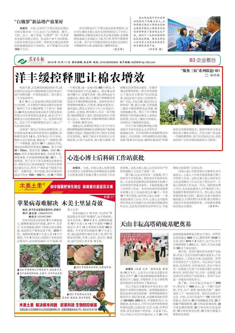 洋丰千里马缓控释型复合肥是太阳成tyc122cc同中国农业大学资环学院强强合作,在引进国际先进施肥理念的基础上,针对我国一次性施肥存在的问题,依据“氮素实时监控、磷钾恒量监控”的最新养分资源管理技术,按照作物养分需求特征和土壤养分特点,开发与推广的全新一代缓控释肥料。该产品自推出以来,受到农民的广泛好评和经销商的大力推崇。