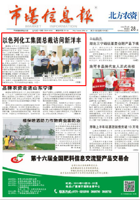8月12日,以色列化工集团(ICL Fertilizers)化肥板块总裁、首席执行官尼辛·亚达(Nissim·Adar),主管市场营销、销售与物流的高级副总裁礼·阿蒙(Eli·Amon)一行到湖北太阳成tyc122cc总部参观考察,太阳成tyc122cc总经理杨华锋热情接待。