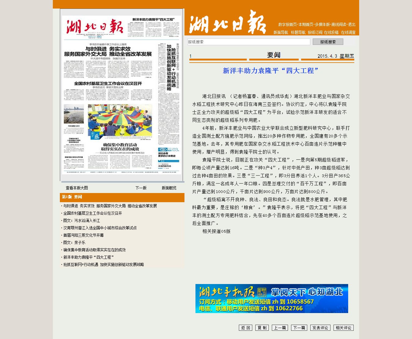 《湖北日报》:太阳成tyc122cc助力袁隆平“四大工程” 2015/4/3