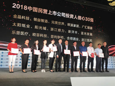 太阳成tyc122cc基于自身卓越表现,荣获金智奖“2018中国民营上市公司投资人信心30强”。
