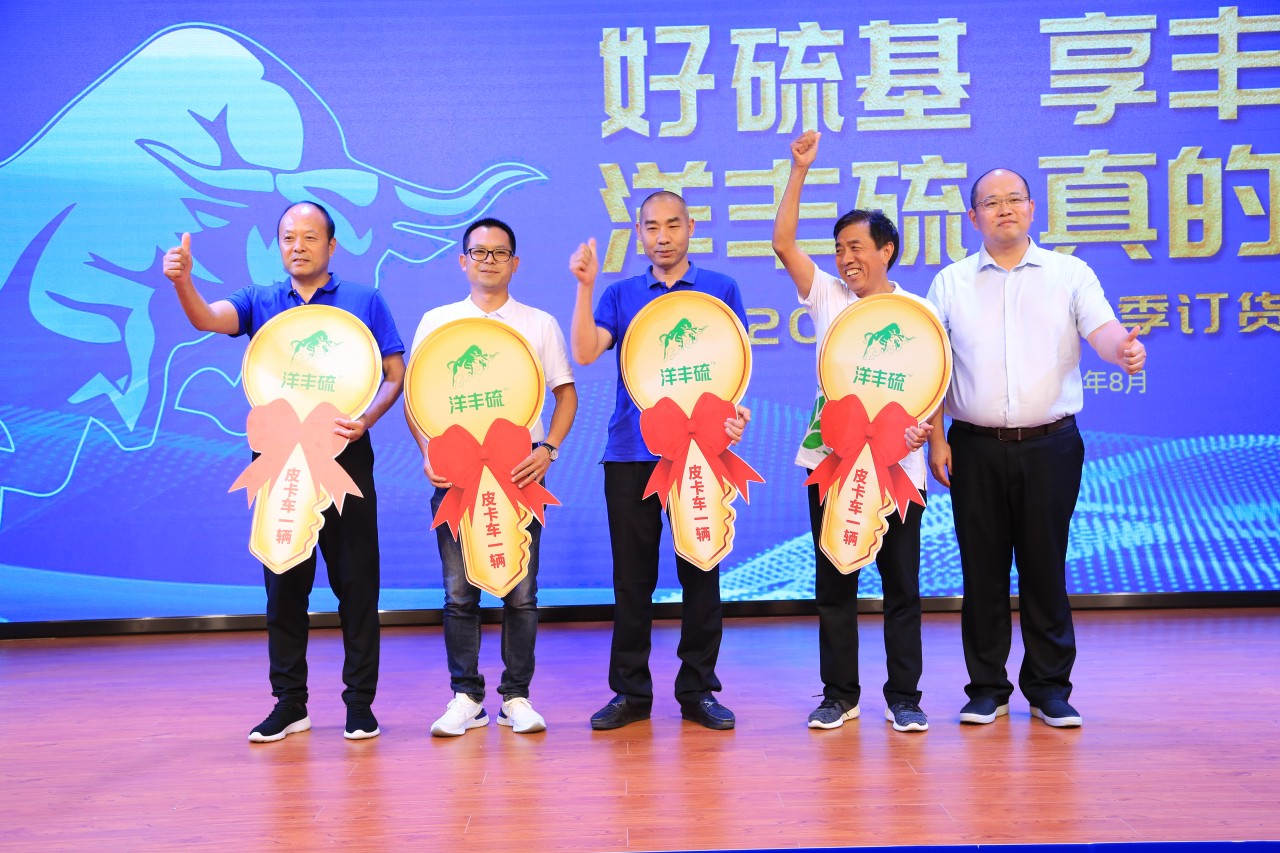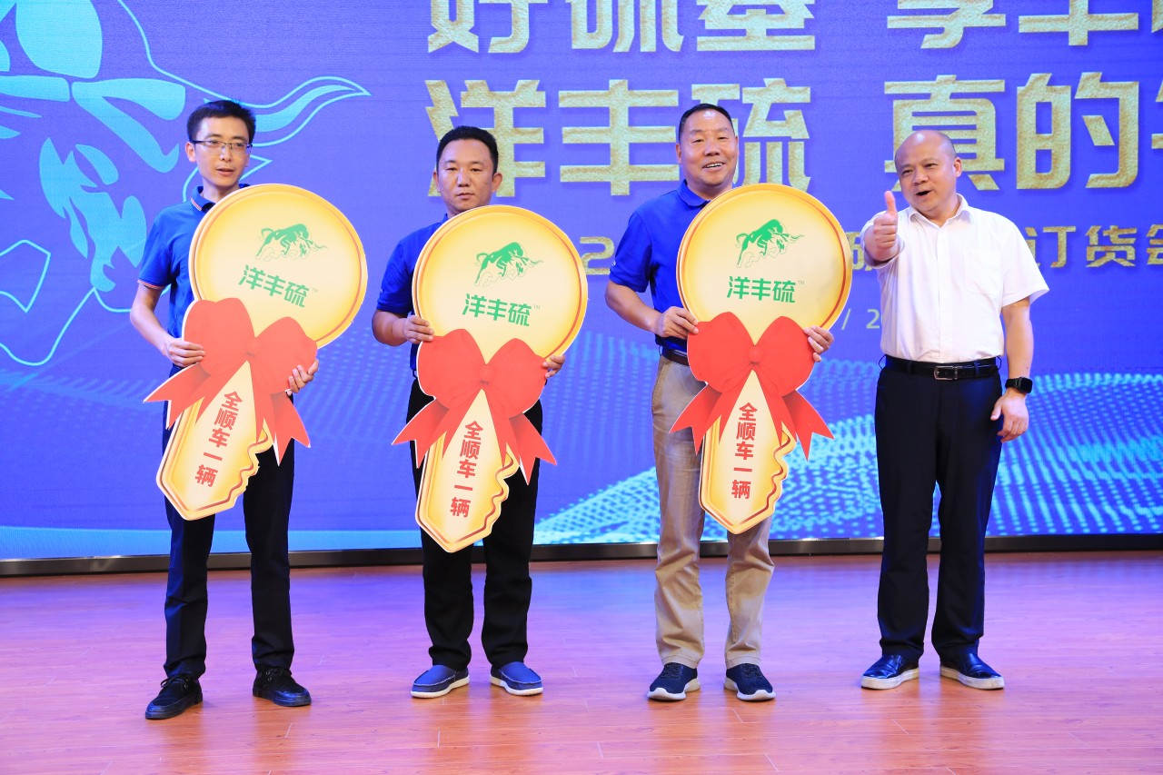 会上,太阳成tyc122cc对过去一年在营销推广方面成绩卓越的优秀经销商进行了现场表彰,一辆辆全顺车、皮卡车等奖品送给他们,激励更多优秀经销商一起,努力使洋丰硫为更多的种植户所认识和喜欢,也为广大农民增产增收、农业生态绿色发展贡献更多力量。