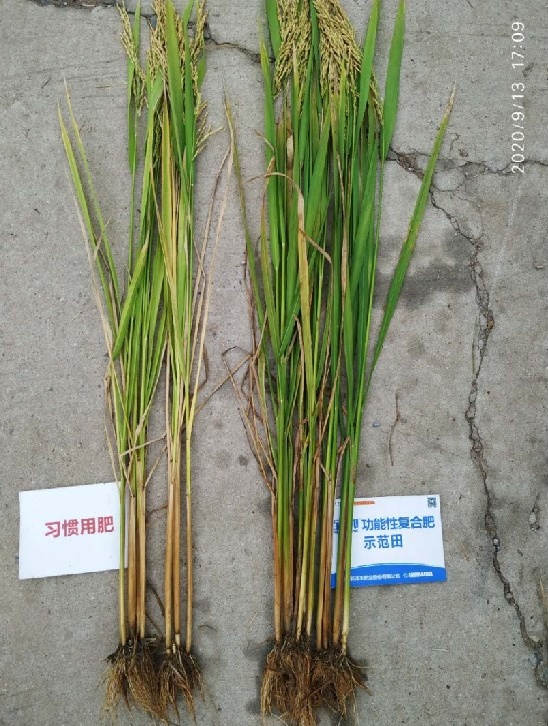 该示范田苗期与对照田相比,地上部分长势并无明显差异,但是根系明显比对照田多。到了水稻黄熟期,示范田叶青籽黄,能明眼看出整体长势更好。随机选取稻株,示范田水稻茎秆更加粗壮高大、剑叶更加青秀、穗子大小更加整齐且长度更长,而稻穗大小除了与品种有关外,也与孕穗期的营养有关,说明海藻肥让水稻孕穗期营养充足,颖花分化较好,有利于形成大穗。